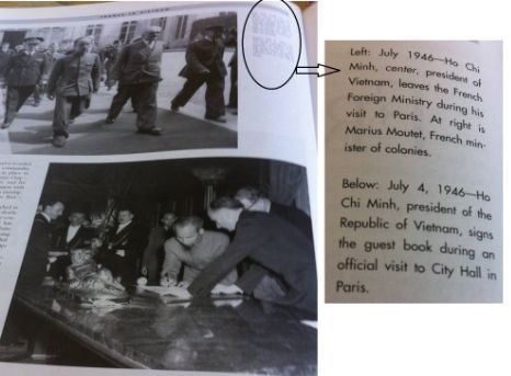 Hình trên: Tháng 7, 1946, HCM Chủ Tịch Nhà Nước Việt Nam đi giữa, rời văn phòng Bộ Ngoại Giao Pháp trong chuyến qua Paris. Bên mặt là ông Marius Moutet, Bộ Trưởng Ngoại Giao.Hình dưới: Ngày 4 /7/1946, HCM, Chủ Tịch của Nước Việt Nam Dân Chủ Cộng Hòa, ký tên vào quyển khách đến thăm trong lúc viếng Tòa Thị Chánh tại Paris.